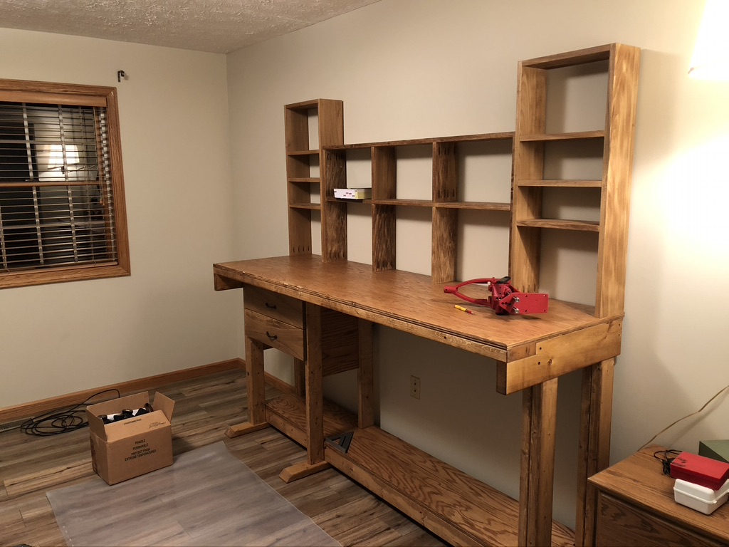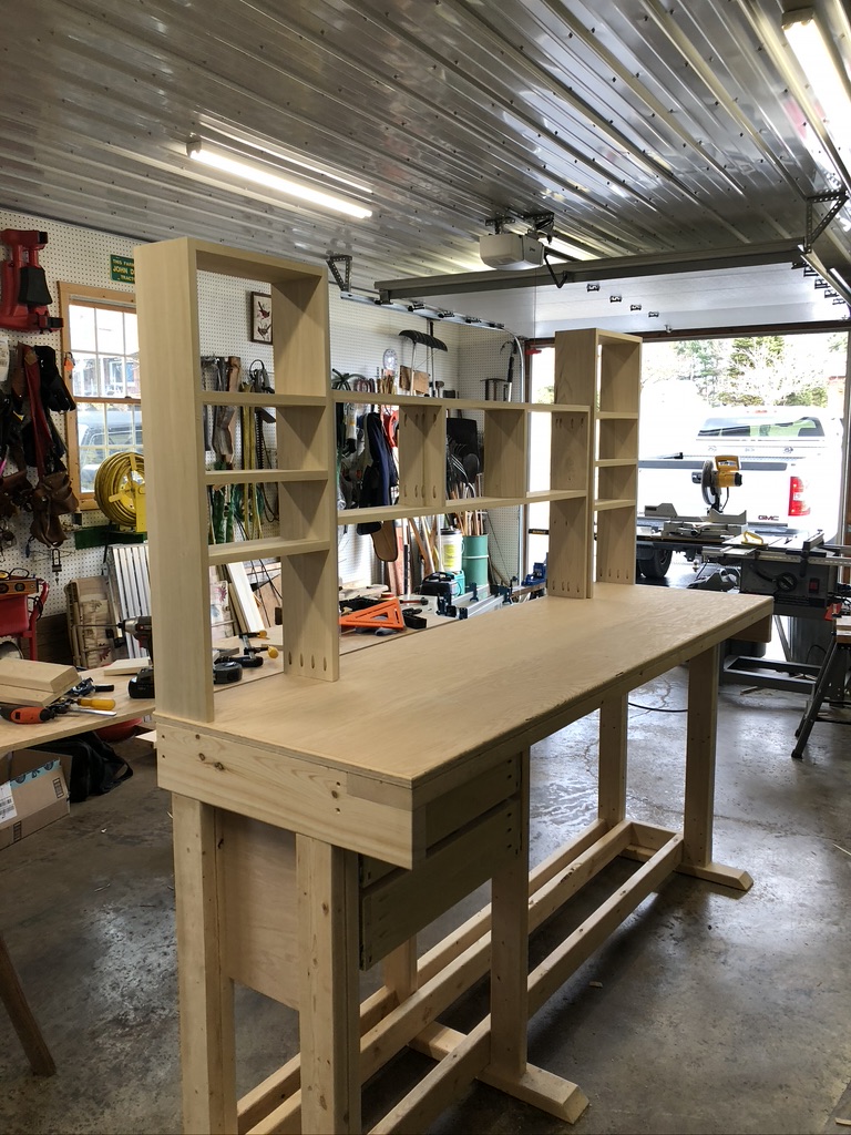 Small but convenient ! I have to remove some things for some task but I make it work . Made the Bench out of 2X4 / 2x6 and 3/4 plywood . Drawers and shelves are 3/4 poplar . Top is 66”x 30” , cabinets solid oak . My Brother is a cabinet maker . Last Pic is a 8’ Bench I built for my Shooting Buddy up the street.